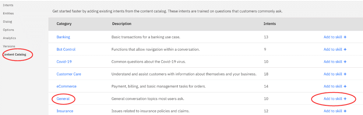 Step 3.1. Click on Content Catalog > General can be added to skill (it includes lots of basic contents of conversation, like good morning. But in this tutorial, we are not going to use it)