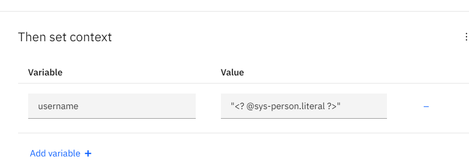 Step 3.11. Click on node options on the Name node > Add child node, called “Dessert” > create condition: #name, add or, select @username, add or, select @sys-person > there are node options on the right of Assistant responds > Select “Open context editor” > Variable is username > Value is “<? @sys-number.literal ?>” > Assistant responds: What desserts would you like, $username?