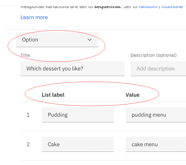 > Back to Dialog > Create a new child node on the Dessert node, called “menu” > condition is #menu > Assistant responds: Ok, here is our menu. > Add new response type > Text changes to Option > Title: Which dessert/ menu you like? > List labels are Pudding and Cake, Value is pudding menu and cake menu.