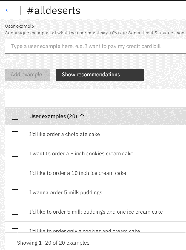 Step 3.14. Click Intents tab > Create Intent called “#alldesserts” > list more desserts as possible, including cakes and puddings.