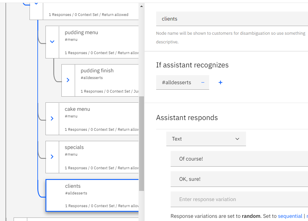 It’s also possible that a client wants to know the cake menu after she/he chooses the pudding menu. Therefore, you need to think about how to create nodes and intents.