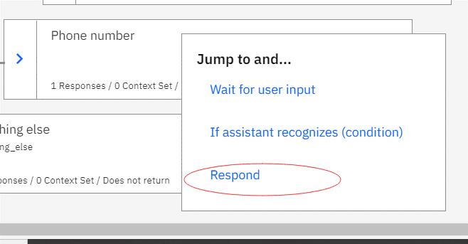 Step 3.19. Select “pudding finish” node > Wait for reply (on the “The assistant should”) needs to change to Jump on > Select “phone number” node, and click on Respond.
