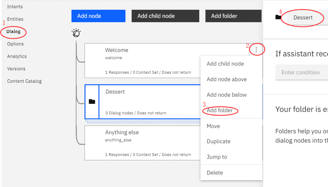 Step 3.2. Select Dialog > Click on the Node options on the Welcome node > Add folder > named “Dessert”.