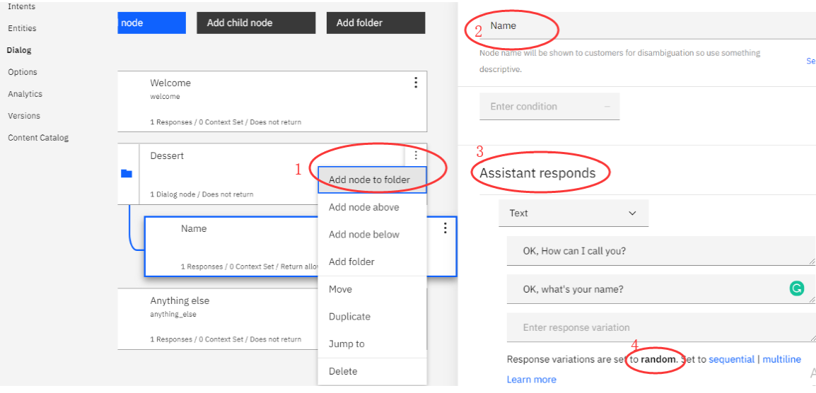 Step 3.5. Click on Node options on the Dessert folder > add node to folder, called “Name” > Assistant responds: OK, how can I call you? / what’s your name? > Response variations are set to random again.
