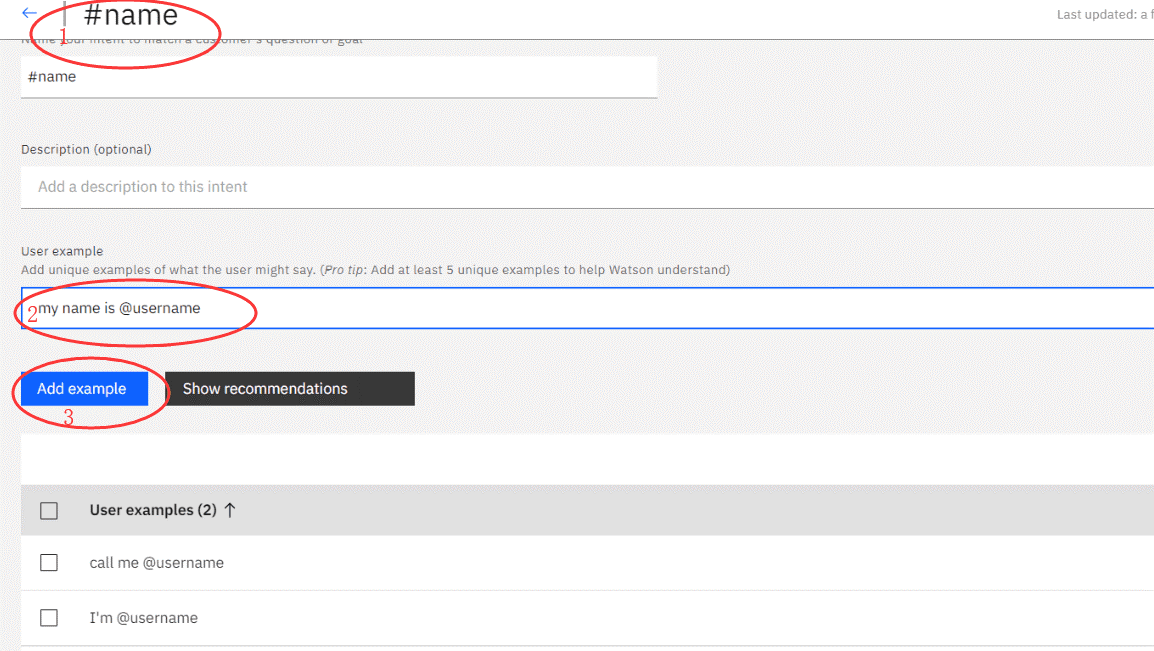 Step 3.6. Click on Intents > Create Intent > create a #name > add example: