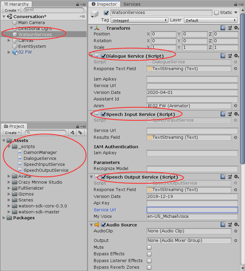 Step 5.2. Click on WatsonServices on Hierarchy window, and open the “_scripts” file on Project window. Dialogue Services is the script of DialogueService, and it also links to Watson assistant. Speech Input Service is the script of SpeechInputServices, it links to Speech to Text service, and Speechoutput links to Text to Speech service in IBM Watson, that is applied to create a spoken sound version of the text. Please double-click on the three services in Visual Studio.