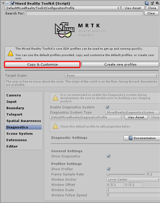 2.In the inspector, click the “Copy & Customize” button of the Mixed Reality Toolkit component.