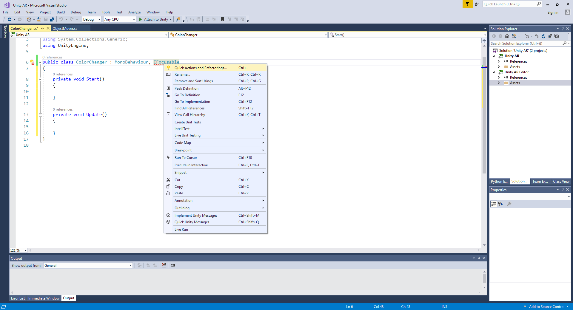 IFocusableinterface. To do so, add it in the class declaration:public class ColorChanger : MonoBehaviour, IFocusable { ... } - Most likely, your Visual Studio will now complain that the methods of the interface are not implemented. The fastest way to fix this it to perform a right-click on the interface name with the error underlining and select “Quick Actions and Refactorings… > Implement interface”.