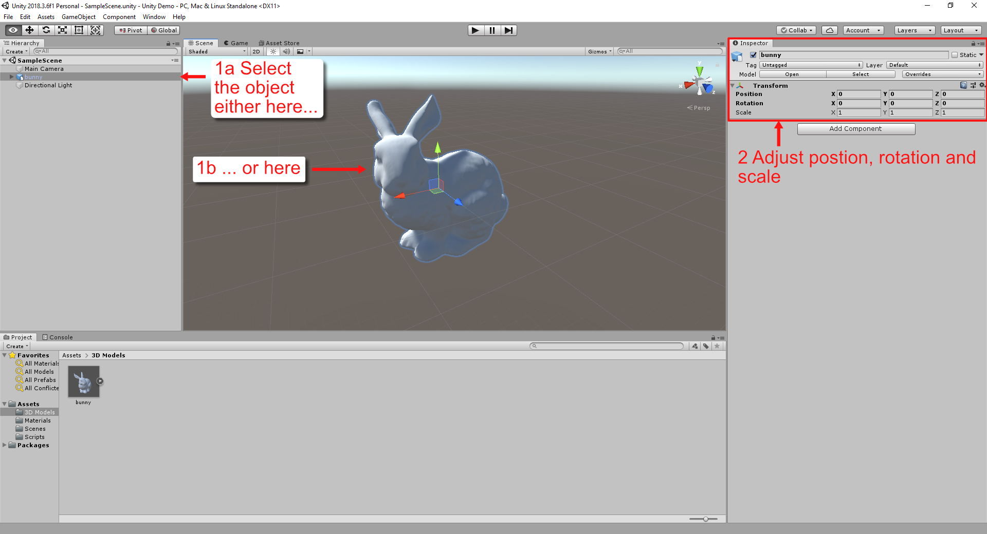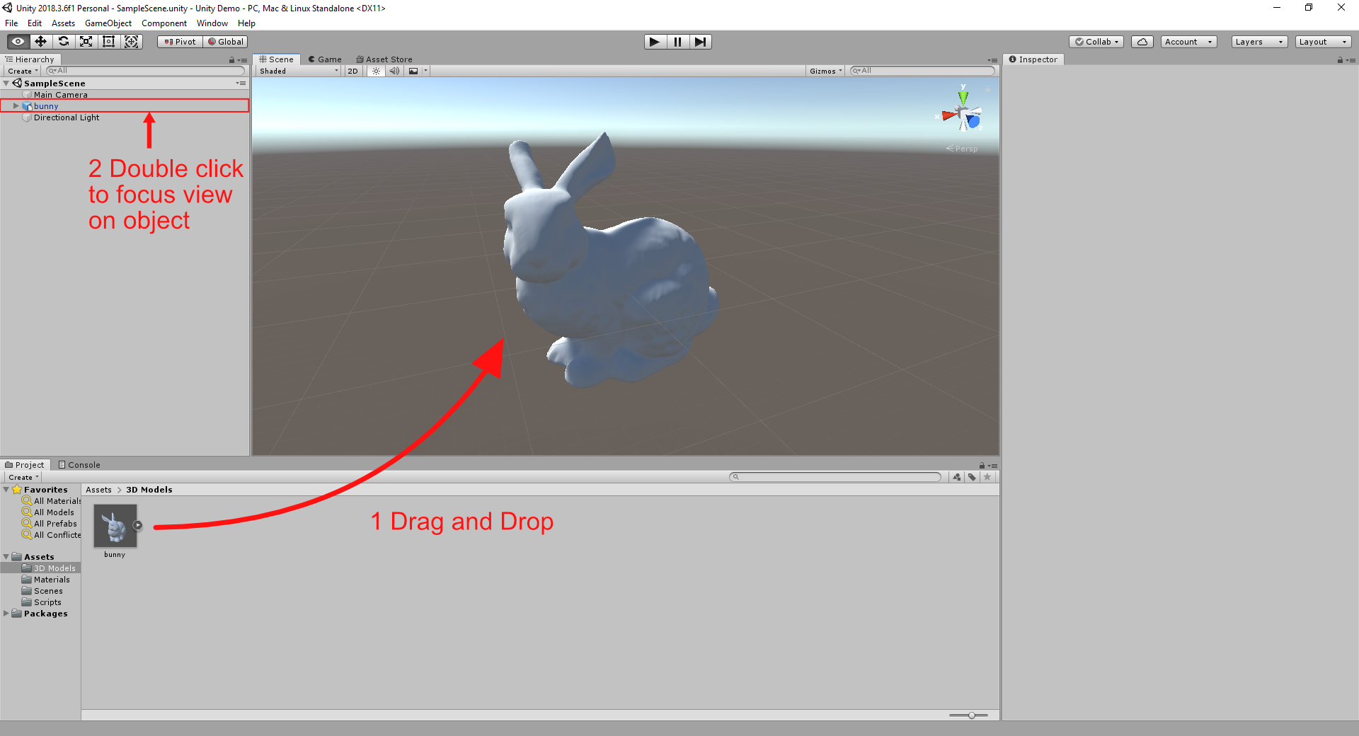 3.Once the project has been created, the 3D model can be imported. To do so, open a file browser and navigate to the project’s folder. Here, create a folder called “3D Models” and copy the 3D model there. You can use any compatible 3D model format. In the example we use the Stanford bunny in the .obj file format. It can be downloaded in the supplementary material.