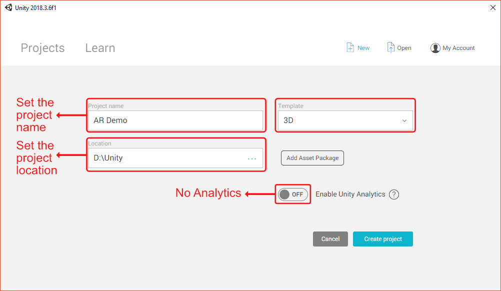 - Enter a project name and set its location. Make sure that a 3D template is used and that Unity Analytics is turned off. When logged in with an account, Unity Analytics gives developers a real-time insight into data about how users interact with their application. It is not required in this example.