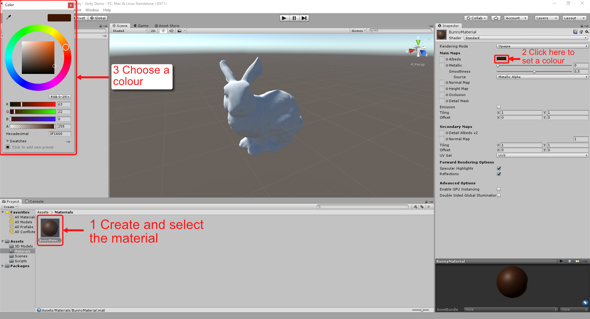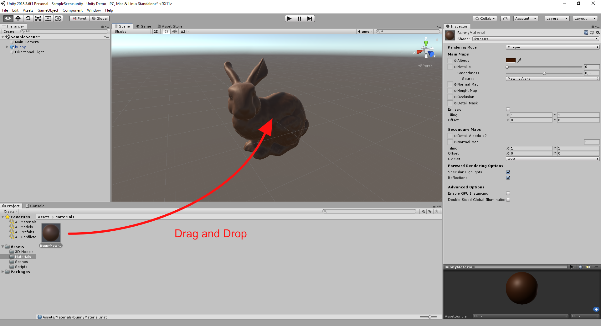 6.It is also possible to add a material to the bunny which can be used to add colour to the object’s surface. In order to do this, create a new folder called “Materials” in the root directory of the assets browser. Then right-click on the assets browser and choose “Create > Material”. Give the material a descriptive name, e.g. “BunnyMaterial”.