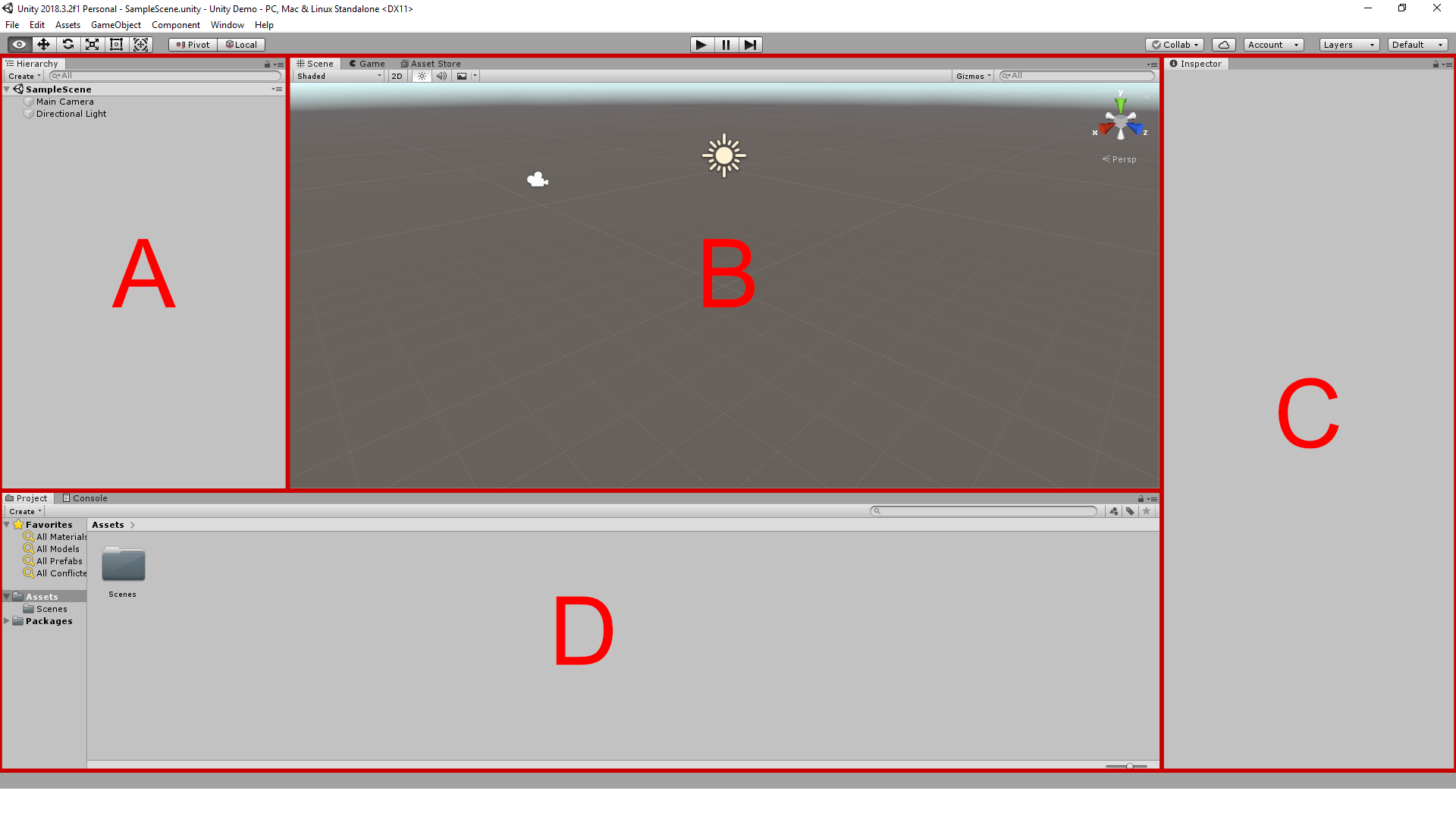 The following description of the panel positions refers to Unity’s default layout. The layout can be changed under Window > Layouts > Default.