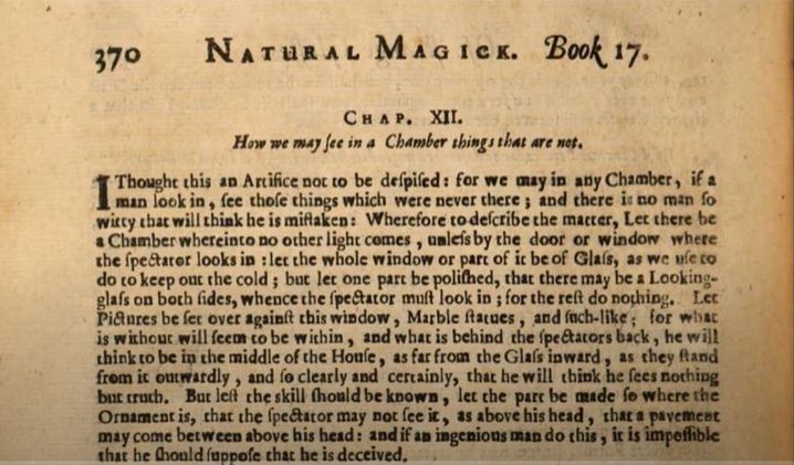 Let there be a chamber wherein no other light comes, unless by the door or window where the spectator looks in. Let the whole window or part of it be of glass, as we use to do to keep out the cold. But let one part be polished, that there may be a Looking-glass on bothe sides, whence the spectator must look in. For the rest do nothing. Let pictures be set over against this window, marble statues and suchlike. For what is without will seem to be within, and what is behind the spectator’s back, he will think to be in the middle of the house, as far from the glass inward, as they stand from it outwardly, and clearly and certainly, that he will think he sees nothing but truth. But lest the skill should be known, let the part be made so where the ornament is, that the spectator may not see it, as above his head, that a pavement may come between above his head. And if an ingenious man do this, it is impossible that he should suppose that he is deceived.