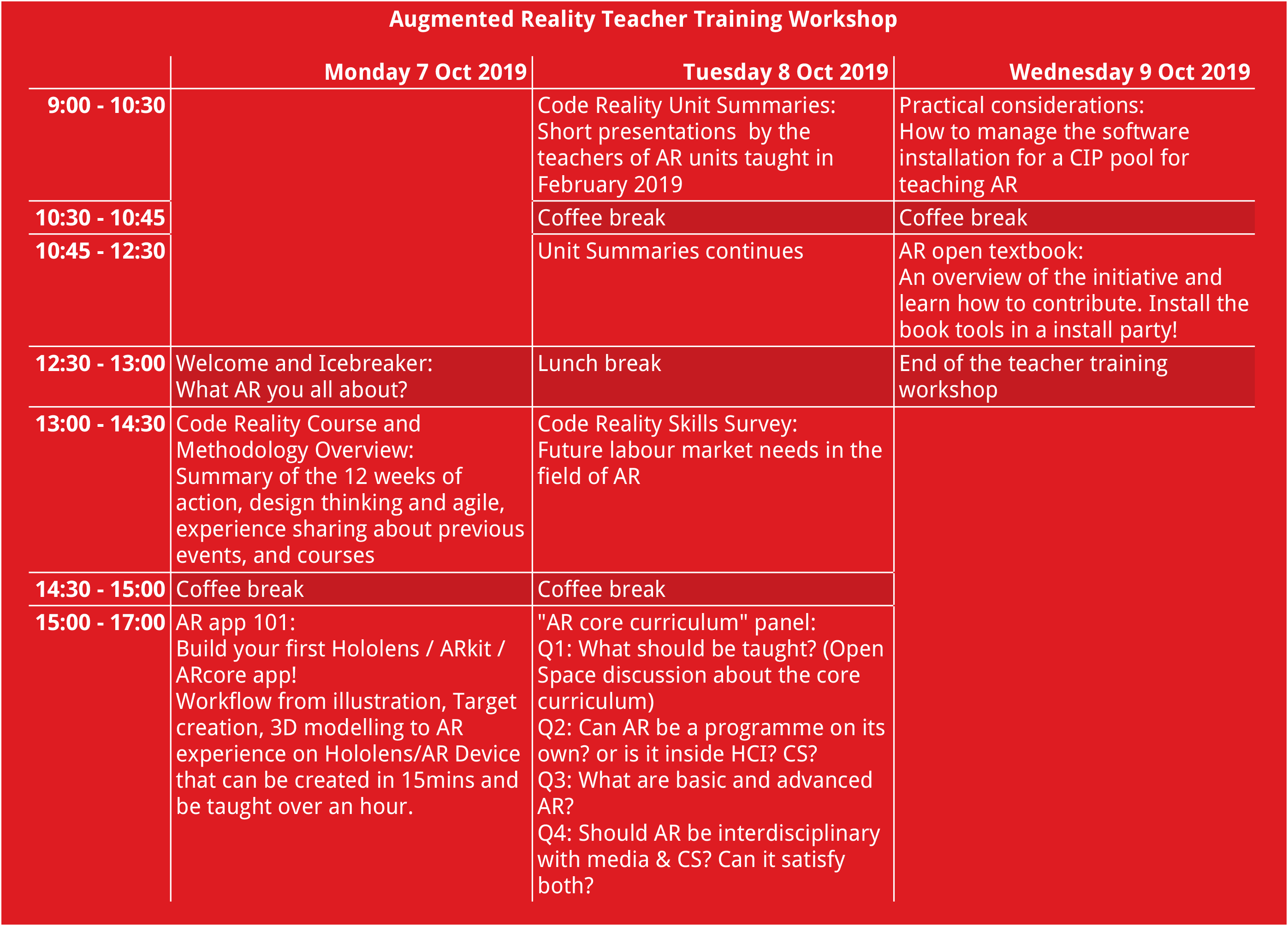 Having experience teaching AR or related topics is not a requirement. The Code Reality team will share experience from teaching AR, the methodology and the teaching materials. We will engage into discussions where all other participants will be able to share their own experience and ask questions.